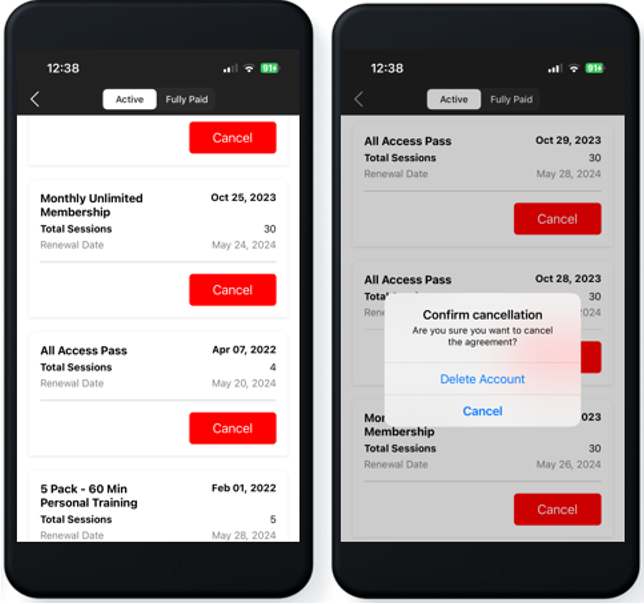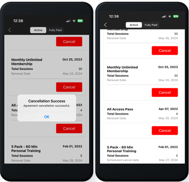 1. Módulo de Membresías: Cuando la opción de cancelación de acuerdo está disponible en myFitApp, los usuarios pueden seleccionar el módulo y ver tanto sus acuerdos pagados como activos, y cancelar fácilmente un acuerdo activo.