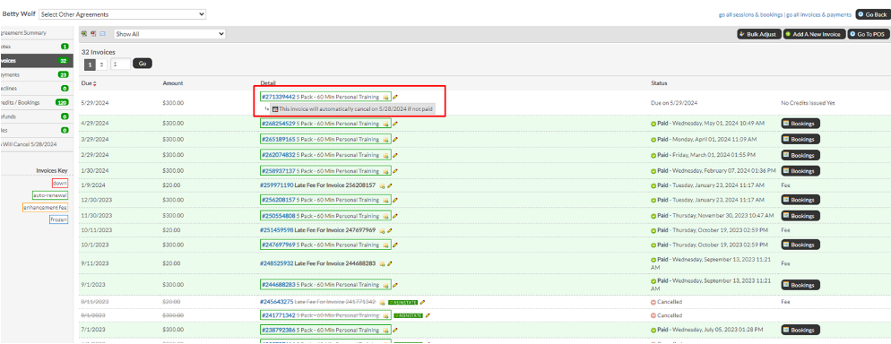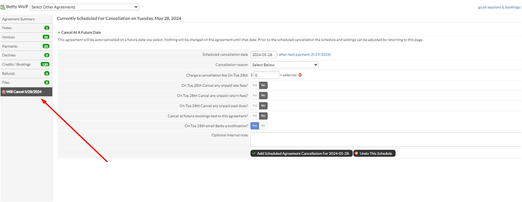 4. Confirmación en ClubReady: Una vez que el acuerdo está cancelado, la cancelación puede verse inmediatamente en ClubReady bajo los acuerdos del usuario.