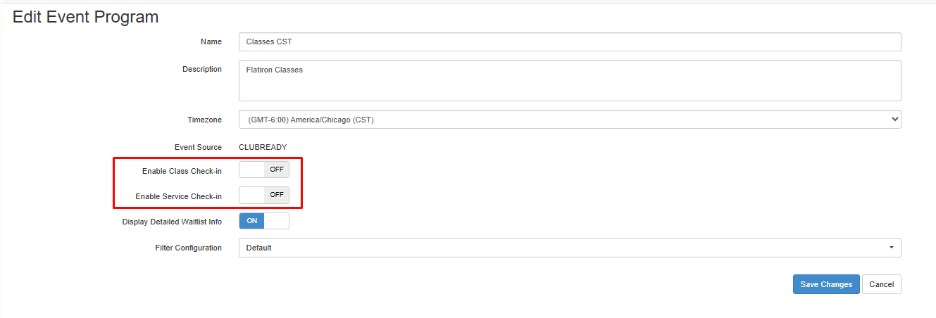 Para habilitar la opción de registro para su aplicación móvil, navegue a su ClubReady Fit Cockpit. Bajo Eventos > Administrar Eventos, haga clic en el lápiz de edición junto a el evento que necesita tener la opción de registro habilitada. Si su cuenta tiene múltiples eventos, la opción de registro debe habilitarse para cada evento individualmente. Hay un interruptor de registro solo para clases y un interruptor de registro solo para servicios. Por defecto, las opciones de registro están desactivadas. NOTA: Solo los usuarios con acceso a ClubReady Fit Cockpit y la pestaña Eventos tienen la capacidad de habilitar la opción de registro.