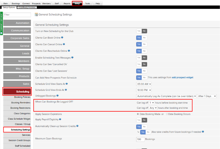 En ClubReady, navegue a Configuración > Programación > Configuración de Programación > ¿Cuándo se pueden registrar las reservaciones?