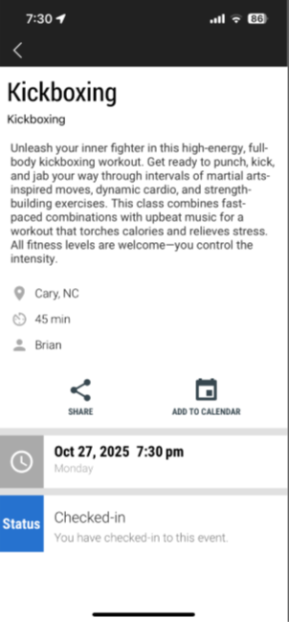AVISO LEGAL: La opción de registro no está configurada con geovallas. El usuario no tiene que estar a cierta distancia de la ubicación para registrarse. La opción de registro aparece para todos los usuarios que tienen una reservación mientras la opción de registro esté habilitada. Los usuarios pueden registrarse y aún así no presentarse a una reservación. Si esto sucede, el estado de la reservación del usuario puede cambiarse en ClubReady a No Asistió.